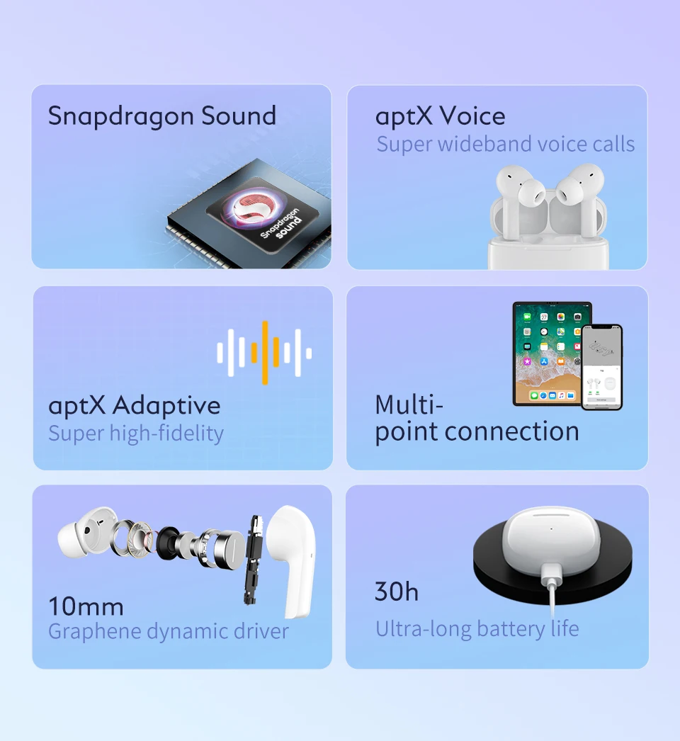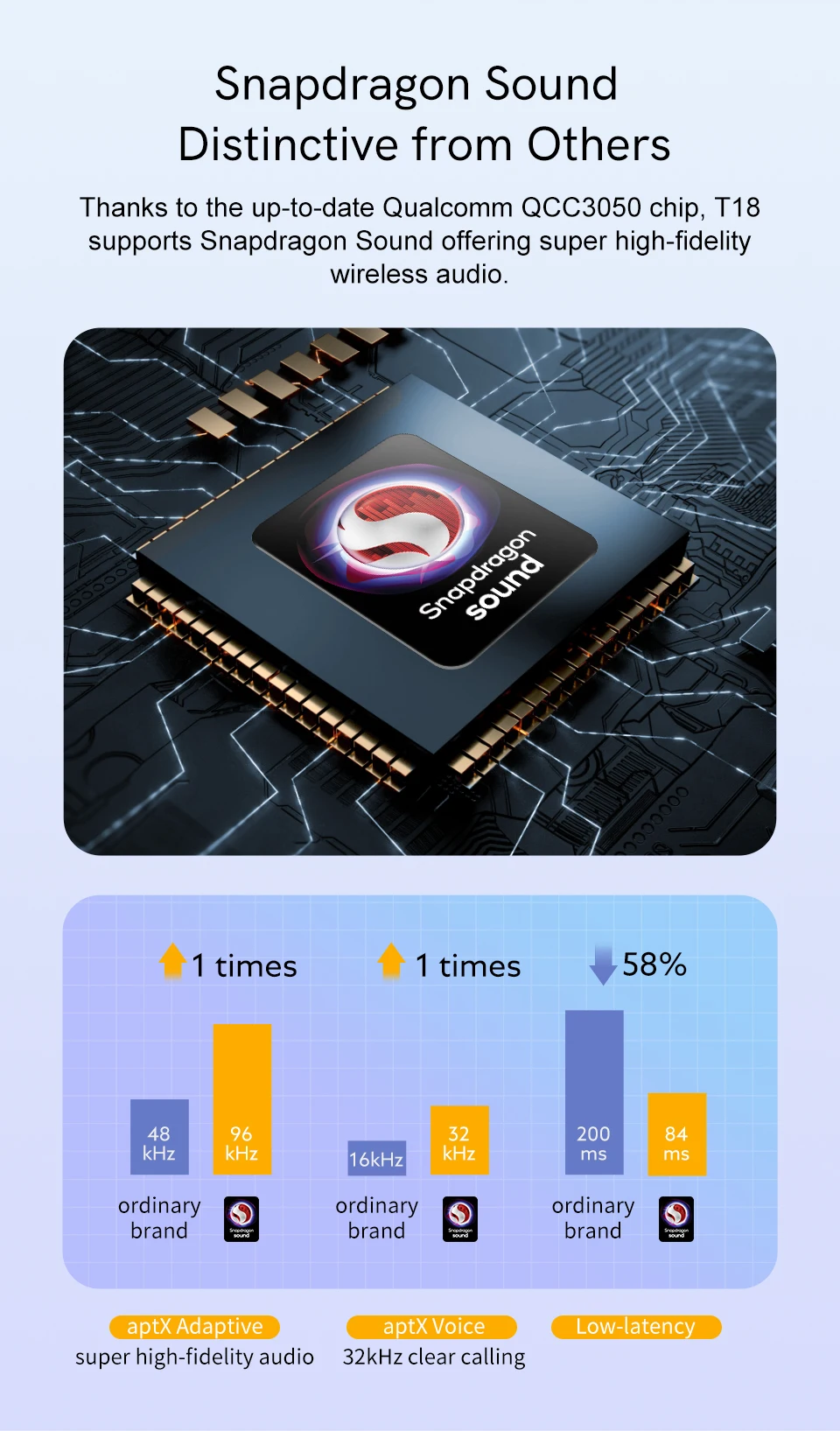 Thanks to the up-to-date Qualcomm QCC3040 chip, T18 supports Snapdragon Sound offering super high-fidelity wireless audio.