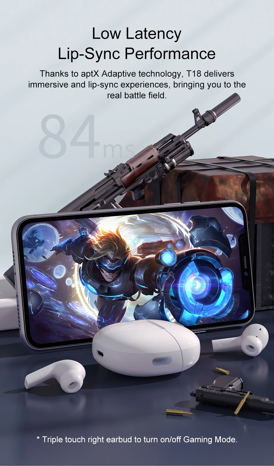 Thanks to aptX Adaptive technology, T18 delivers immersive and lip-sync experiences, bringing you to the real battle field.