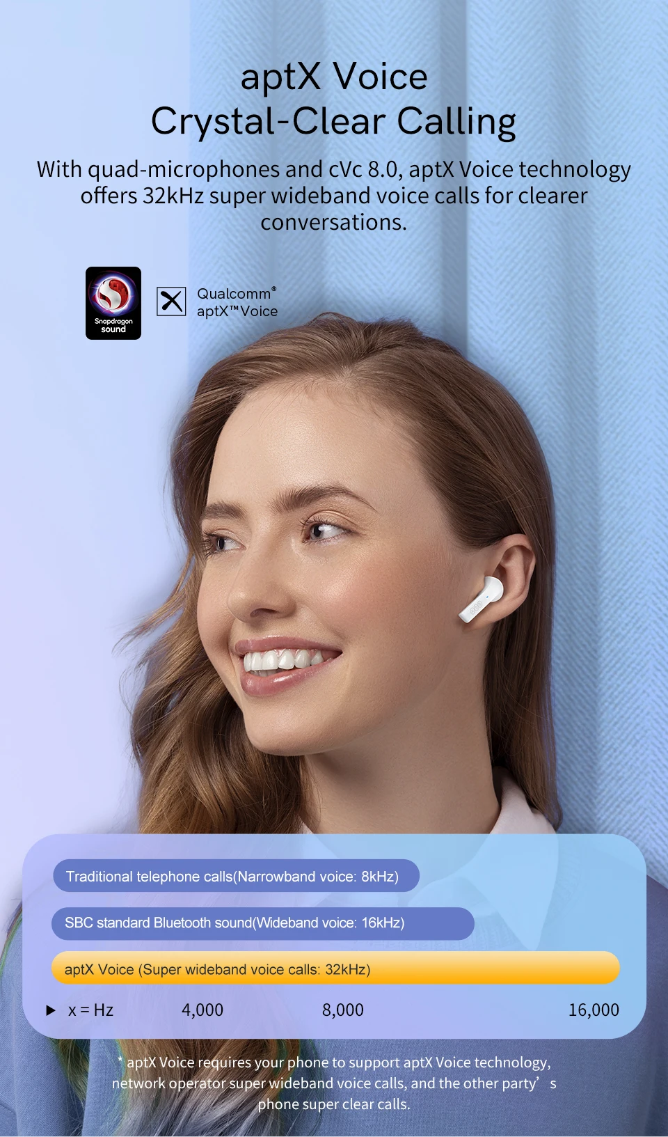 With quad-microphones and cVc 8.0, aptX Voice technology offers 32kHz super wideband voice calls for clearer conversations.