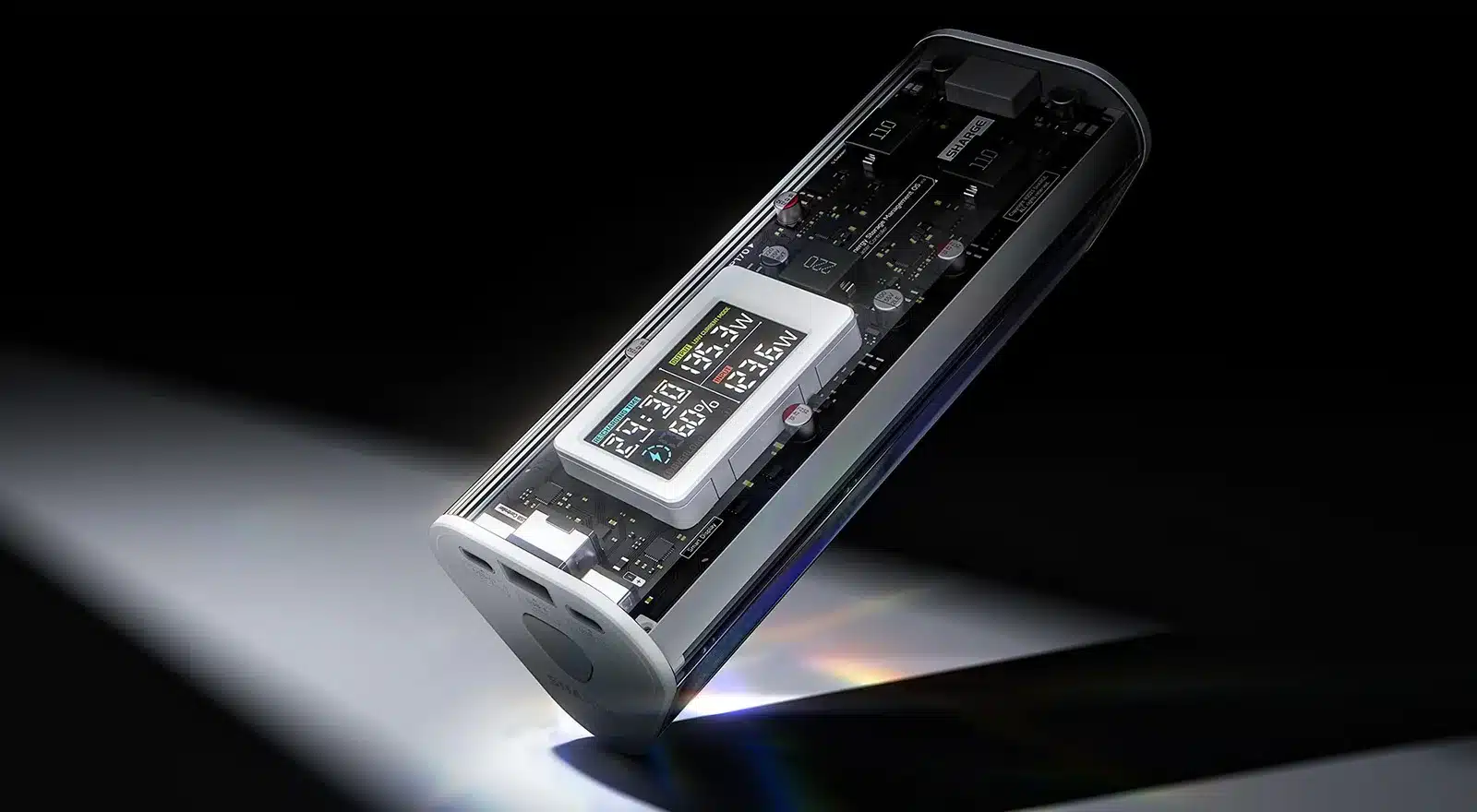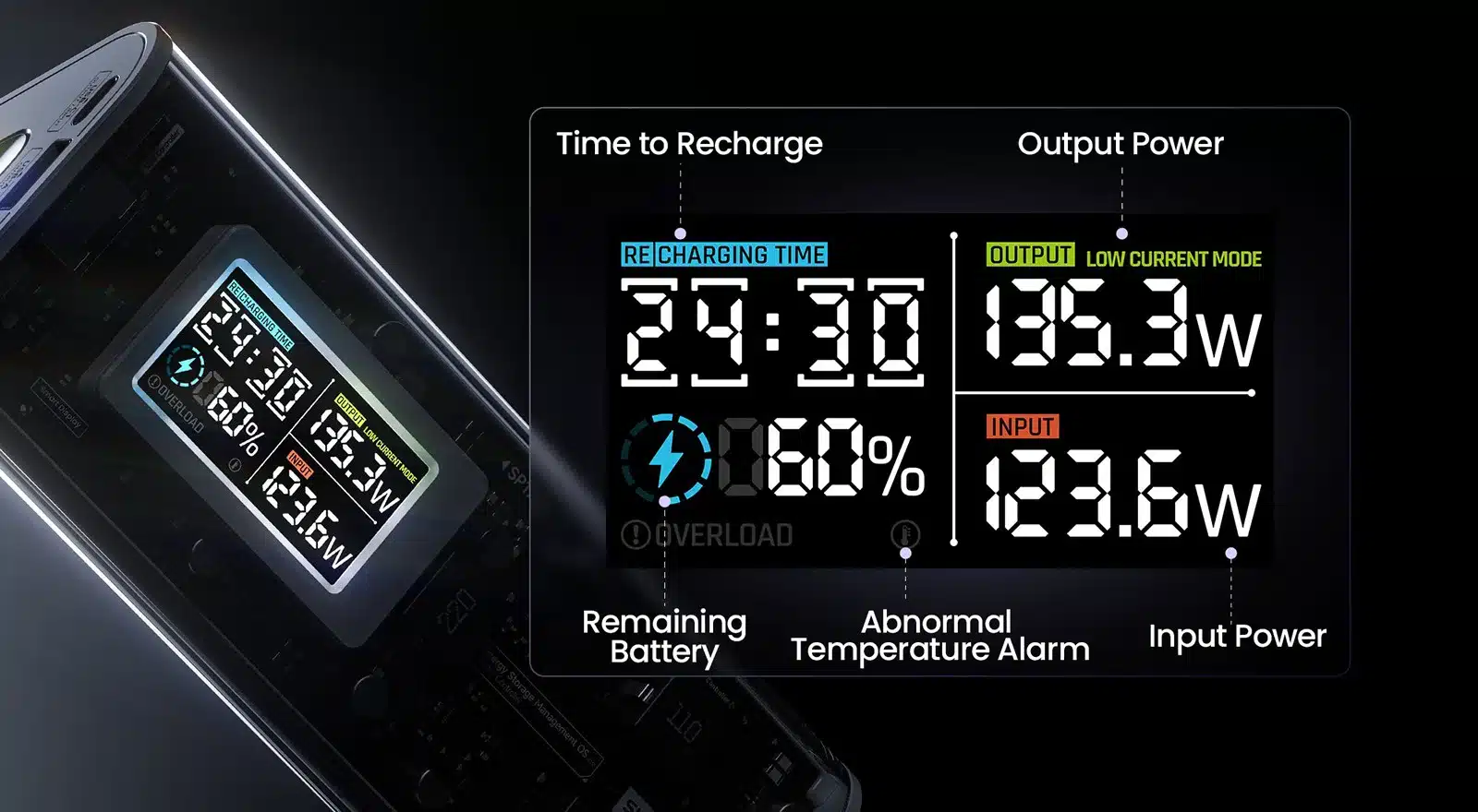 Smart Display: Transparent design with a display showing charging power, time, and battery level. Monitor status anytime, anywhere
