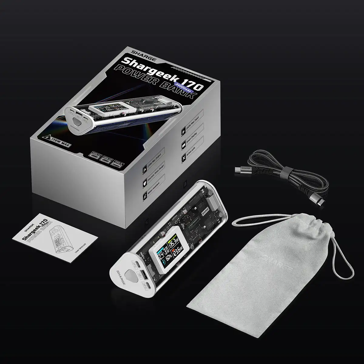 What You Get: Shargeek 170 power bank, 240W C-C cable, travel pouch, user guide