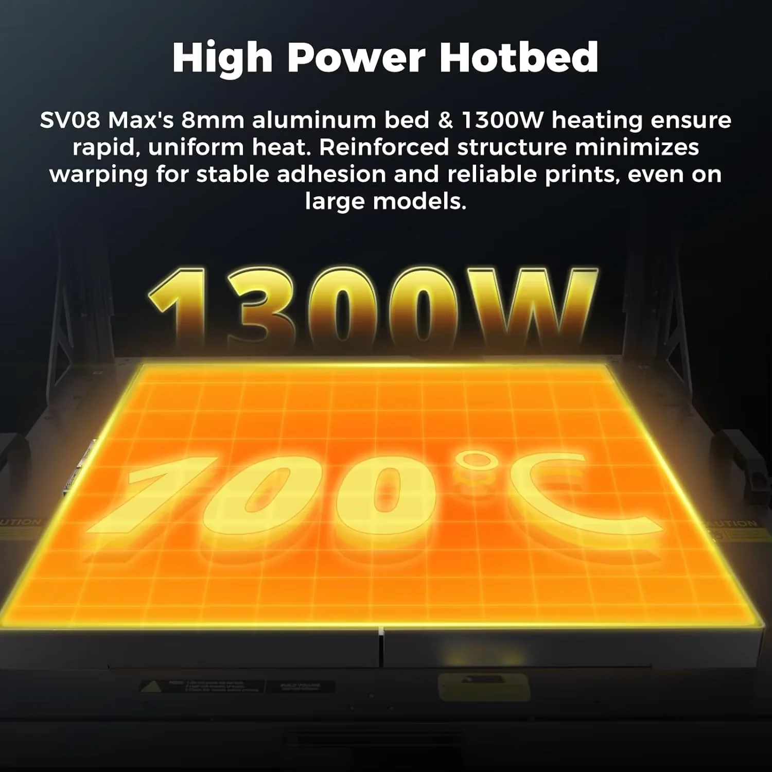 • Thickened Hotbed: Features an 8mm thick aluminum bed with 1300W power for rapid, even heating and minimal warping.