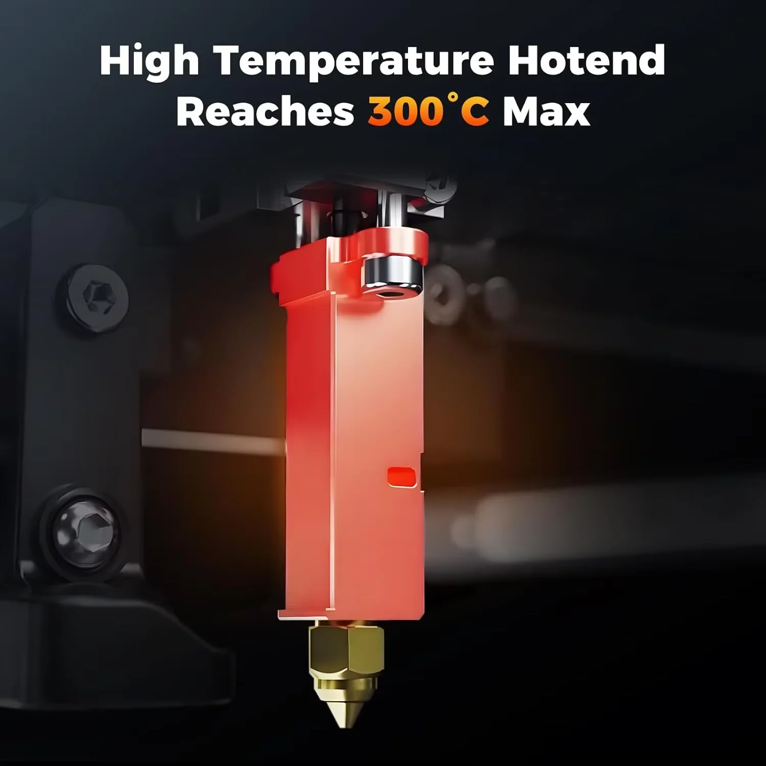 • High-Temperature Hotend: Supports up to 300°C, compatible with a wide range of filaments including PLA, TPU, PETG, ABS, ASA, PA, PC, PLA-CF, PETG-CF, and HP-PLA.