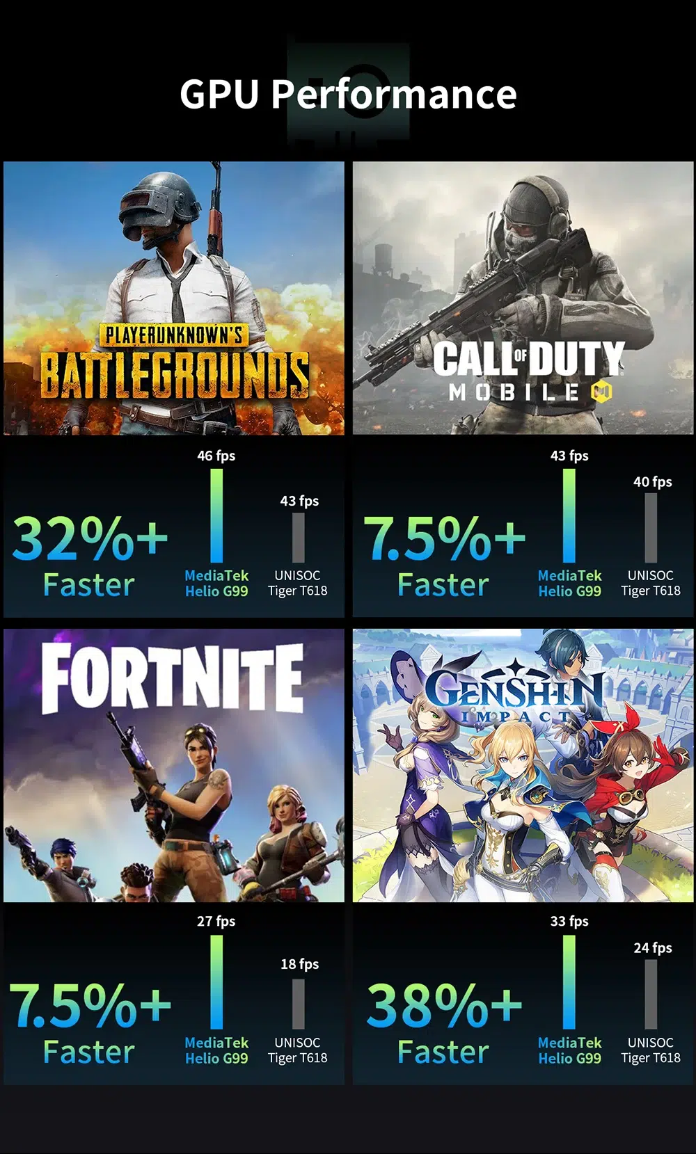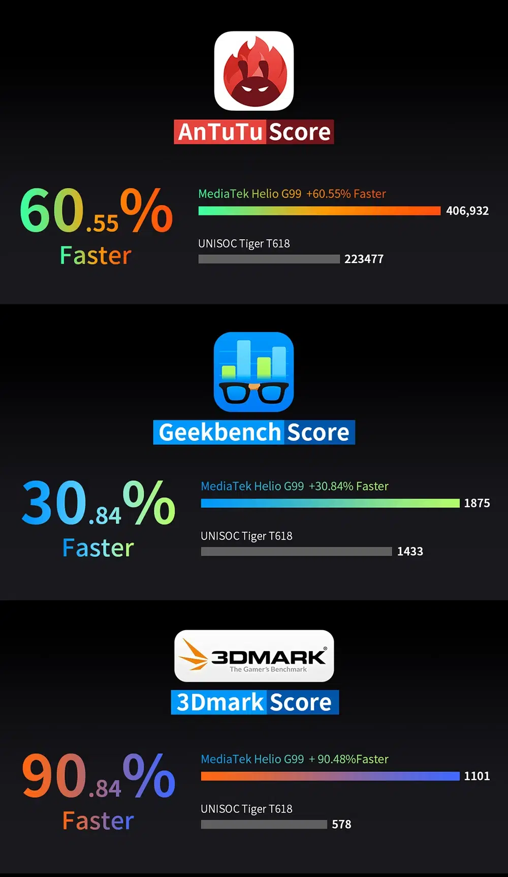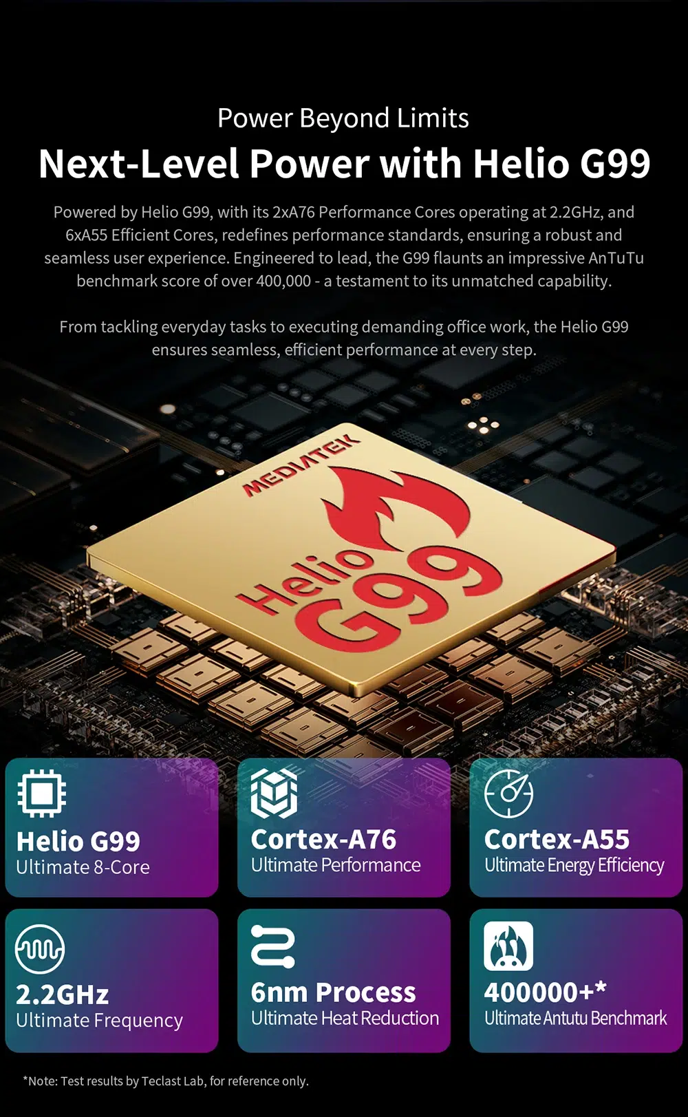 | CPU | MediaTek Helio G99, 2 Cortex A76 cores, 6 A55 cores, Mali-G57 MC2 GPU, 6 nm process |
