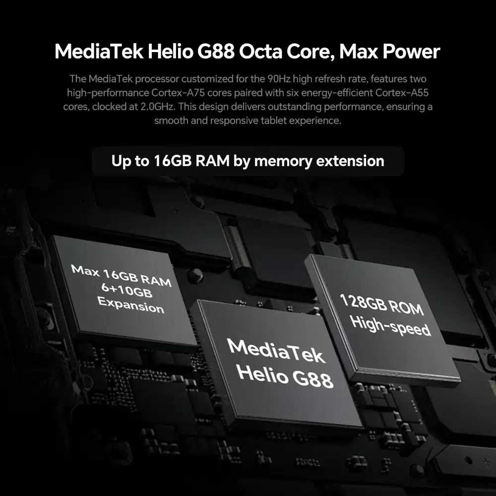 Equipped with the MTK Helio G88 Octa-Core processor, the T60 Plus handles all your tasks—from multi-app multitasking to light gaming and browsing—with ease. 6GB LPDDR4X RAM (expandable up to 10GB virtual RAM) and 128GB UFS storage ensure fast, responsive performance and ample storage for all your needs.