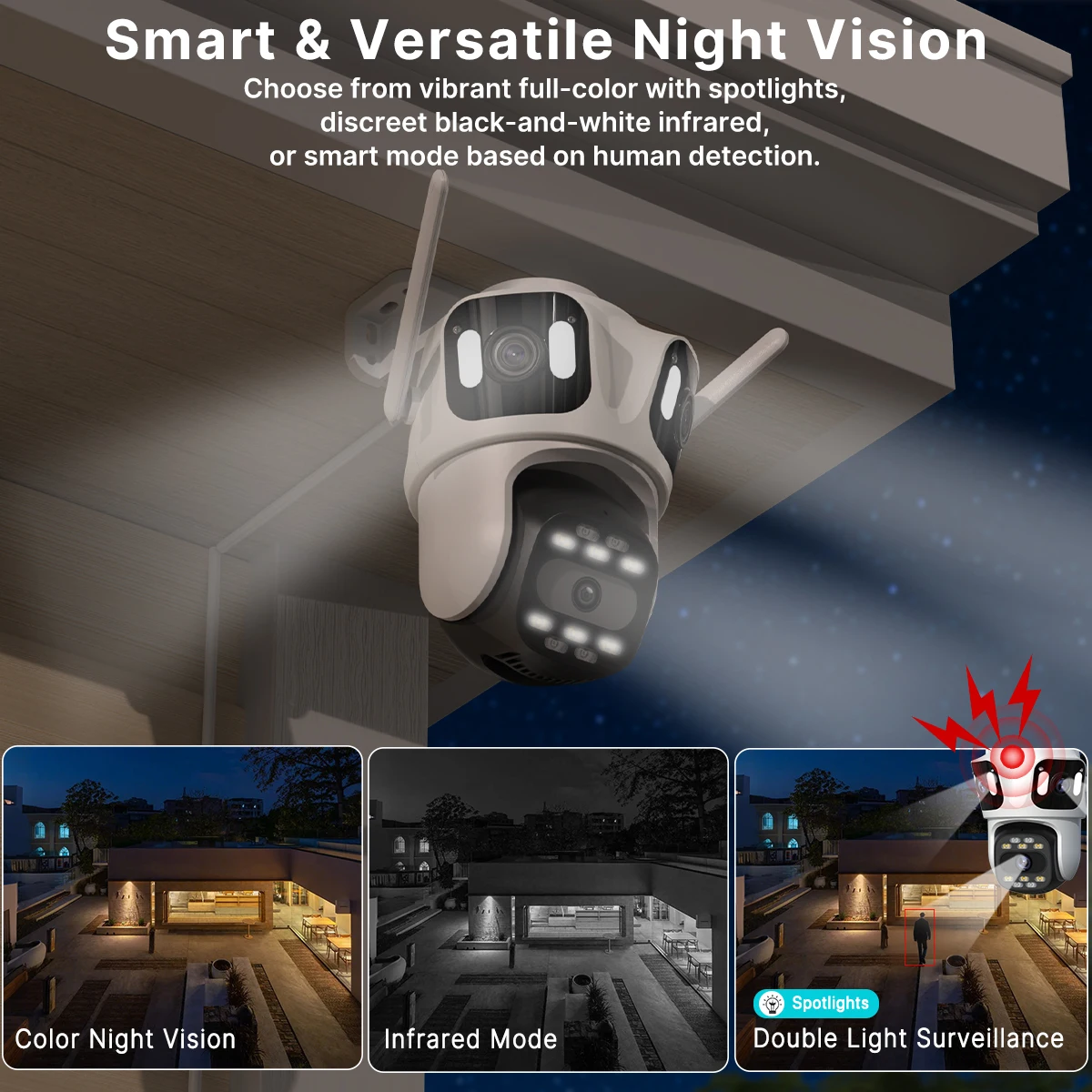 Experience advanced security with this Triple Lens PTZ WiFi Camera featuring three-screen real-time monitoring via the iCSee app. 📱 The triple-lens design offers comprehensive coverage: two fixed cameras and one PTZ camera that pans, tilts, and tracks automatically to follow moving humans with AI humanoid detection. 🤖