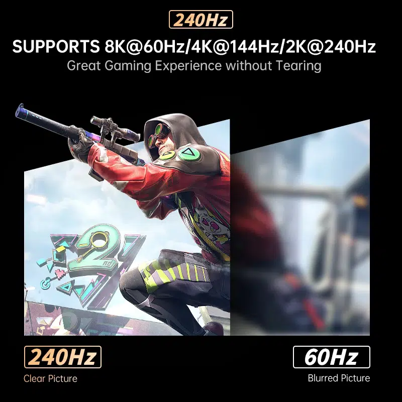 - Resolution Support: 8K at 60Hz, 4K at 144Hz/120Hz
