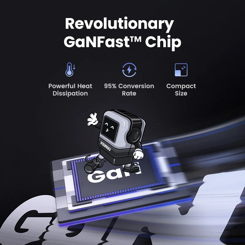 Charge your devices swiftly with the UGREEN 65W GaN Charger, featuring a distinctive Uno Robot design 🤖 that adds a playful touch to your tech setup. This compact charger employs advanced gallium nitride (GaN) technology, making it smaller and more energy-efficient while minimizing heat generation.