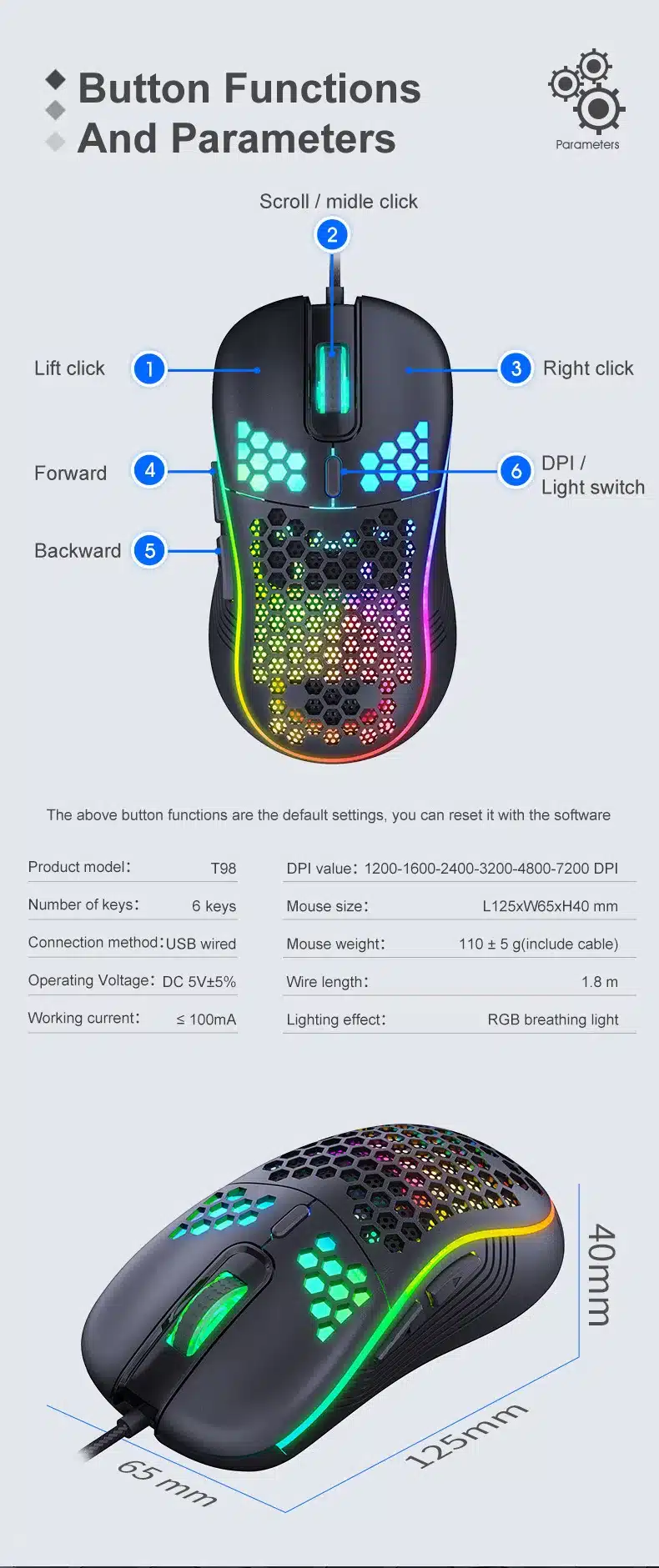 The gaming mouse adopts honeycomb Shell, which not only has a delicate appearance, but also makes you feel comfortable and easy to operate with 78G light weight, holding the mouse for a long time will not feel tired.