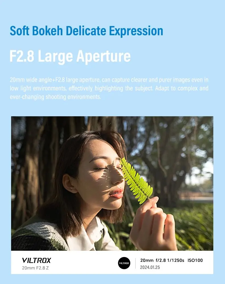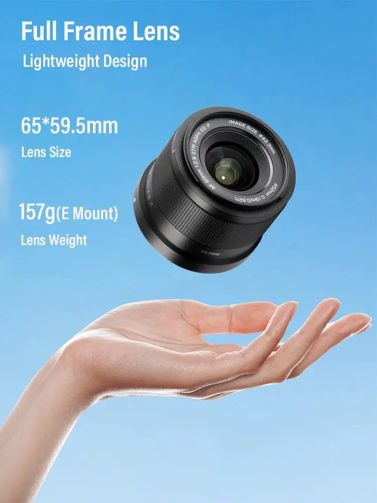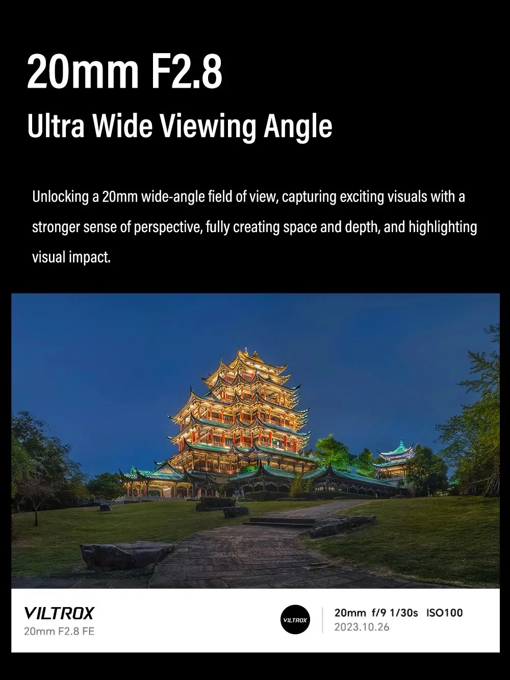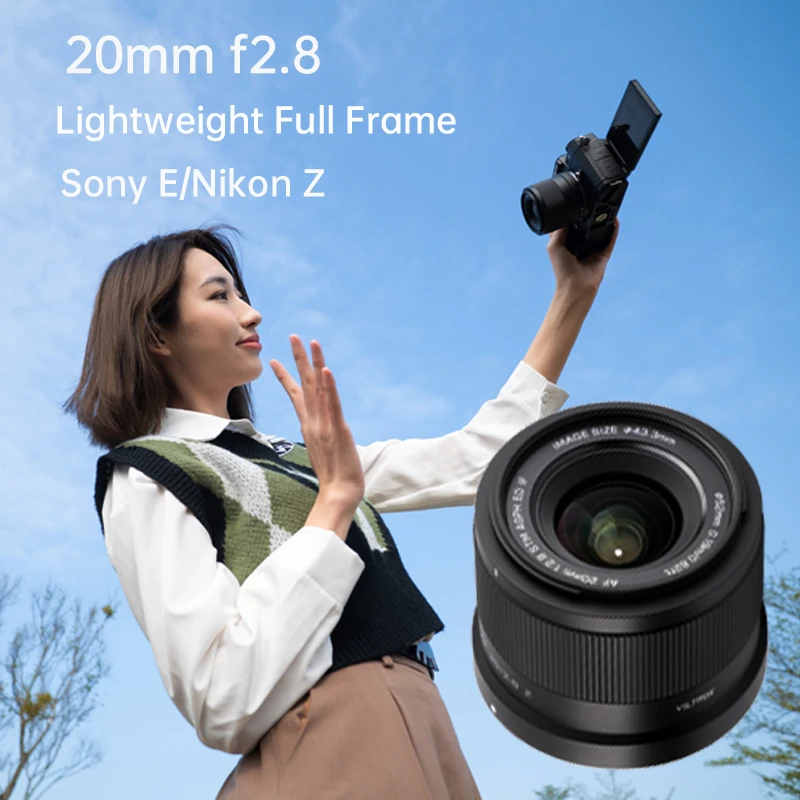 Experience stunning visuals with the VILTROX AF 20mm F2.8 FE lens, designed for Sony E-mount and Nikon Z mount full-frame and APS-C mirrorless cameras. Featuring a compact design at 65x66mm and weighing between 101-150g, this ultra-wide-angle prime lens offers a 20mm focal length with a bright f/2.8 aperture.