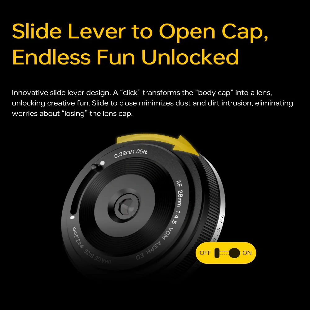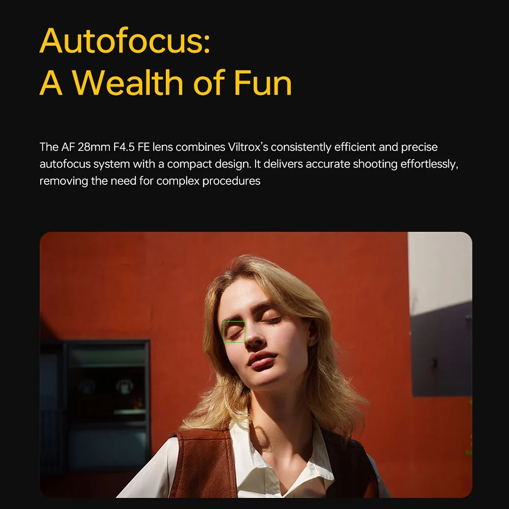 Discover the VILTROX 28mm F4.5 pancake lens, designed for full-frame mirrorless cameras with Sony E mount compatibility including models like A6700, ZV-E10, A7M5, and a7iii, as well as Fuji X series. This ultra-thin, lightweight lens weighs just 60g, making it perfect for photographers on the go. 📸