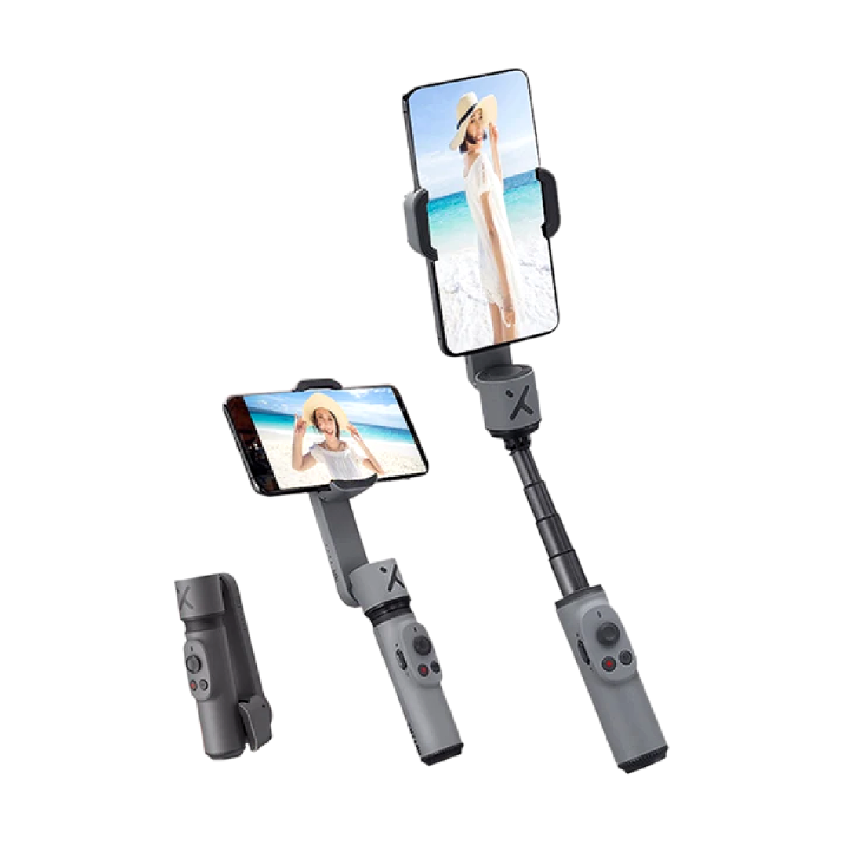 Lightweight 2-axis gimbal with extendable grip and rotatable axis. Gesture control, 5.5-hour battery, and ZY Cami app for editing. Compatible with iPhone, Samsung, Huawei, and more.