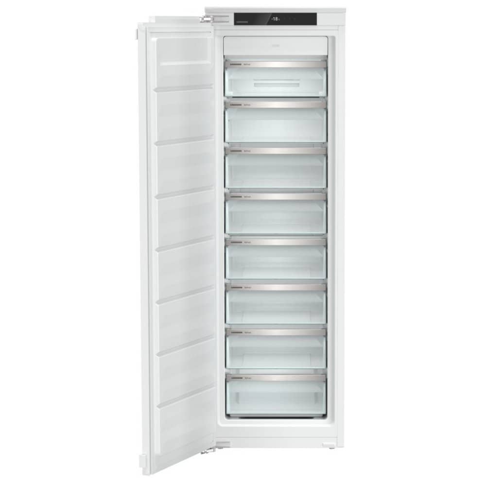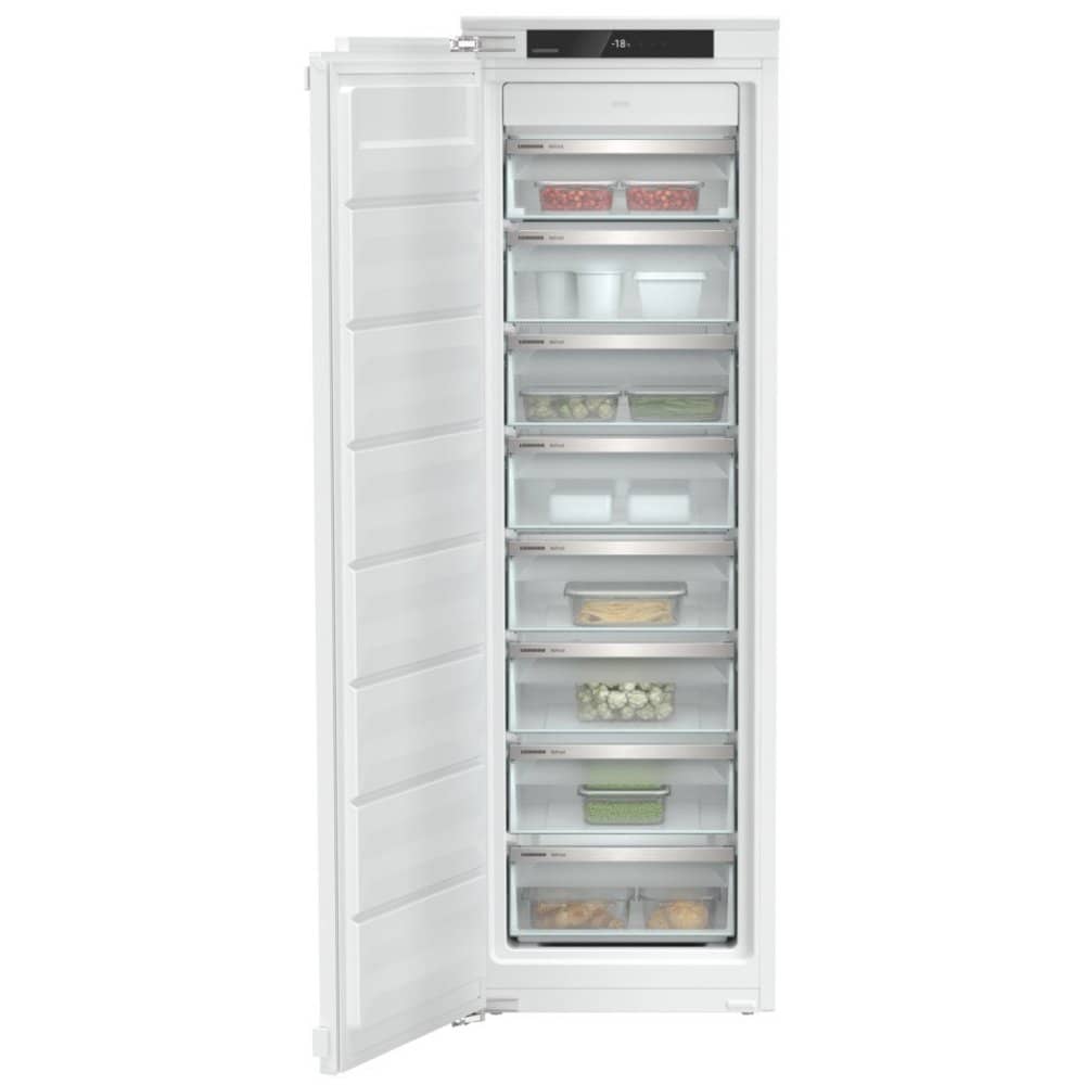 Never be tight for space again thanks to this brilliant Liebherr integrated freezer! Designed to be fitted into a tall housing unit with your own furniture door attached, this freezer blends in effortlessly with the rest of your kitchen. Offering a net capacity of 213 litres, this freezer features 8 removable transparent drawers with pull-out stops, allowing full access to each drawer without the risk of it falling out when fully opened. Don’t you just hate when your frozen goods start to defrost on the drive home from the supermarket? Activate the SuperFrost function and enjoy a rapid temperature decrease that freezes food quicker while preserving flavour and nutritional value. Better yet, if you forget to turn the function off, it automatically deactivates itself after 65 hours! Designed to make your life easier, this freezer is frost free. NoFrost technology eliminates humidity while circulating cool air throughout the entire freezer. This means no more painful manual frosting! Finished with a replaceable door seal, a door alarm and an intuitive touch display, step up your freezer game with Liebherr!